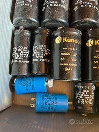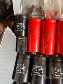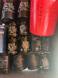 Vendo lotto di condensatori elettrolitici industriali/vintage provenienti da magazzino. Contenuto del lotto Presenti circa 27 condensatori tra cui: •Itelcond ARUX 33000 µF 100V (2 pezzi) •Itelcond ASX 470 µF 500V (2 pezzi) •Itelcond ARUX 4700 µF 160V (2 pezzi) •SIC-SAFCO FELSIC CO39 (vari valori 220–1000 µF 250V) •Kendeil 10000 µF 63V (2 pezzi) •Kendeil 470 µF 400V •Sprague 4700 µF 25V (2 pezzi) •HPS / Towa 15000 µF 25V (4 pezzi) Inclusi anche accessori di montaggio (staffe/anelli).
