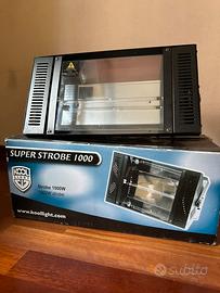 Faro stroboscopico in grado di generare effetto ralenti, grazie alla potente lampadina da 1000W con lampeggio a velocità regolabile. Tramite la staffa in dotazione è possibile posizionare il faro anche su supporti o tralicci.