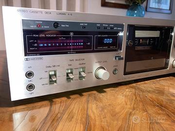 Registratore a cassette Luxman K15 del 1982 circa, dotato di tre testine e due motori, con trasporto a doppio capstan, meccanica robustissima interamente in metallo e peso ragguardevole di 12 kg. E' stato totalmente revisionato con cambio cinghie e idler, pulizia, lubrificazione e taratura. E' compatibile con nastri ferro, cromo e metal ed ha il Dolby B ed HX Pro. Il display fluorescente può mantenere indefinitamente il picco massimo, per avere sempre sotto controllo il livello di registrazione. Il suono è di altissimo livello anche grazie alle ottime testine ed allo statdio di preamplificazione interamente a componenti discreti, se escludiamo i compander Dolby, che sono per forza di cose integrati. Sensazione di estrema robustezza nell'azionamento delle varie funzioni meccaniche. Le condizioni estetiche sono molto buone, vedere le foto allegate ed in caso richiederne altre (ne ho più di quante possano essere ospitate qui). Ho disponibile anche un filmato che ne dimostra il perfetto funzionamento, chiedere anche per quello. Fornito con manuale di servizio in PDF.