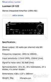 Propongo amplificatore luxman in buone condizioni estetiche e funzionali, eroga 55watt per canale di buona fattura (quasi 10kg) e qualita sonora con tecnologia s.t.a.r circuit … ha una buona entrata phono per giradischi di qualita . Possibilità di ritiro a mano in zona Spedisco con ottimo imballo Vedi altri miei annunci come amplificatore, lettore cd , giradischi, casse e diffusori acustici, subwoofer, sintoamplificatore, dvd , pre e finale ,piastra cassette , equalizzatore , radio tuner e altro materiale stereo hifi .