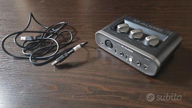 endo M-Audio Fast Track. È una scheda audio USB ideale per chi vuole iniziare a registrare voce o strumenti con buona qualità senza spendere troppo.