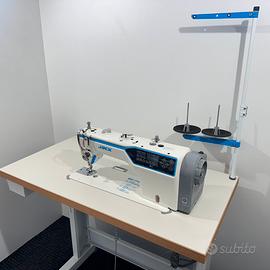 Jack A5E. Lineare computerizzata con ampio spazio sottobraccio e controllo digitale della lunghezza del punto controllata da motorino passo passo, con rasafilo automatico, alzapiedino, fermatura digitale silenziosa e taglio del filo corto. Bacinella olio attaccata.