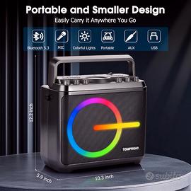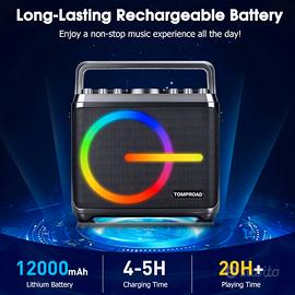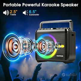 Macchina per karaoke, altoparlante Bluetooth con 2 microfoni wireless, sistema PA portatile per adulti e bambini con luci LED, regolazione dei bassi/acuti, scheda TF/USB, REC per feste a casa(nero) NUOVO MAI USATO LISTNIO 130€ ♫ 【Esperienza karaoke coinvolgente】 Questo karaoke è dotato di un potente woofer da 6,5 pollici e di un tweeter da 2,5 pollici, che offrono una qualità audio eccezionale e bassi profondi per un'esperienza di canto coinvolgente. L'esclusivo design della cavità garantisce un suono ricco e di alta qualità su tutte le gamme di frequenza. Che si tratti di bassi, medi o alti, la qualità del suono è chiara e potente, riempiendo l'intera stanza con un suono surround a 360° coinvolgente. ♫【Sistema karaoke all-in-one, facile da configurare e utilizzare】 Gli altoparlanti A55 Party sono dotati di trasmissione wireless Bluetooth 5.3 avanzata integrata, con una portata fino a 30 metri, e possono essere facilmente collegati a tutti i dispositivi abilitati Bluetooth. Il pannello di controllo è semplice, intuitivo e facile da usare: basta ruotare la manopola per regolare il volume o disattivare l'audio. L'altoparlante ha un design accattivante, arrotondato e dall'aspetto elegante e raffinato. Goditi la tua musica preferita sempre e ovunque, rendendolo il compagno di festa perfetto. ♫【Lunga durata della batteria e riproduzione multipla】Alimentato da una potente batteria ricaricabile da 12000 mAh, garantisce intrattenimento facile per tutto il giorno. È possibile utilizzarlo anche durante la ricarica. Oltre al Bluetooth, supporta anche le modalità di ingresso audio USB/TF card e AUX e dispone di una funzione di registrazione nelle modalità USB e TF card. Può essere facilmente collegato a un televisore o a un computer tramite l'interfaccia AUX. Puoi goderti il carnevale sia che si tratti di una festa da ballo al chiuso o all'aperto. Questo grande altoparlante Bluetooth è perfetto per gite in campeggio, barbecue e persino karaoke, matrimoni, conferenze, ecc.