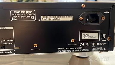 Vendo causa inutilizzo CD Marantz CD6005. Funziona perfettamente, usato ma ben conservato. Completo di istruzioni, telecomando e cavo di alimentazione. Non ho più l’imballo originale. PREFERIBILE il ritiro a mano piuttosto che spedizione onde evitare rotture. Prezzo leggermente trattabile.