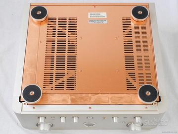 Amplificatore Marantz PM14MK ll KI Potenza di uscita nominale (da 20 Hz a 20 kHz, pilotaggio simultaneo a 2 canali): 100 W x 2 (carico 8 Ω) 160 W x 2 (carico 6 Ω) 200 W x 2 (carico 4 Ω) Distorsione armonica totale (da 20 Hz a 20 kHz, pilotaggio a 2 canali, carico 8 Ω): 0,01% Distorsione di modulazione incrociata (SMPTE): 0,01% Larghezza di banda in uscita (carico 8 ore, 0,04%): da 10 Hz a 60 kHz Risposta in frequenza (CD, SORGENTE DIRETTA): da 5 Hz a 60 kHz, +0/–1 dB Fattore di smorzamento (carico 8 ore, da 20 Hz a 10 kHz): 120 Sensibilità/impedenza di ingresso: PHONO (MC): 290 µV/100 Ω PHONO (MM): 2,6 mV/47 kΩ LIVELLO ALTO: 280 mV/10 kΩ INGRESSO PRINCIPALE: 1,8 V/100 kΩ Tensione/Impedenza di uscita: Uscita PRE: 1,8 V/250 Ω Ingresso PHONO massimo consentito (1 kHz): MC: 11 mV MM: 100 mV Deviazione RIAA (da 20 Hz a 20 kHz): ±0,2 dB Rapporto segnale/rumore (rete IHF A, ingresso in cortocircuito): PHONO (MC): 76 dB PHONO (MM): 90 dB LIVELLO ALTO: 110 dB Controllo tono: BASSI (100 Hz): ± 8 dB ALTI (10 kHz): ± 8 dB Tensione di alimentazione: 230 V CA, 50 Hz Consumo energetico: 300 W Dimensioni (L x A x P): 458 x 166 x 464 mm Peso: 23 kg Accessori: Telecomando (RC-17PM): 1 Dimensioni (L x A x P): 44 x 239 x 17,5 mm Peso: 189 g