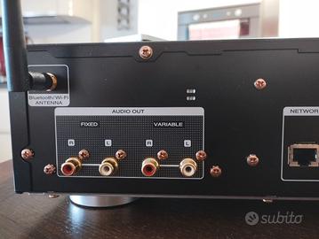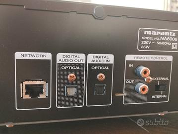 Marantz Na6006 prodotto usato ma praticamente immacolato, è un Network audio streamer con AirPlay, Internet Radio ecc. • Bluetooth •Wifi, ethernet, ingresso ottico (per collegare anche la TV), USB-A, • supporto DSD nativo fino a11.2 • FLAC HD, ALAC, WAV192/24 e Gapless support • architettura dicircuito simmetrico discreta • DAC di elevata qualità • componenti audiocustomizzati • HDAM & HDAM-SA2 • uscite RCA dorate con livello fisso evariabile • Remote bus • RC • HEOS APP con la quale ascoltare tutte le piattaforme come Amazon music, Spotify, Tidal, ecc ecc con qualità superiore al CD. Perfetto in tutto, telecomando e antenne wifi e bluetooth.