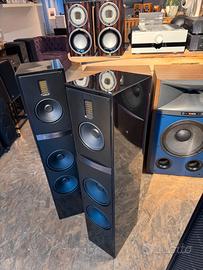 Diffusore da pavimento a 3 vie, doppio bass reflex posteriore, 2 woofer con cono in alluminio a cupola invertita da 203mm, midrange con cono in alluminio a cupola invertita da 165mm, tweeter a nastro Fol-ded Motion™ da 32x61mm. Potenza 20-400W. Efficienza 94dB. Impedenza 4 ohm. Crossover con componenti selezionati e protezione termica/corrente per tweeter. Predisposizione bi-wiring. Disponi-bile in tre finiture, tutte con griglia nera in tela ad attacco magnetico.