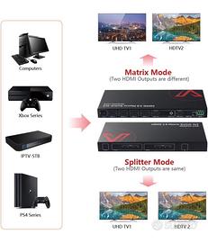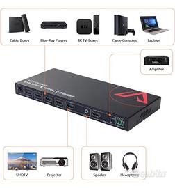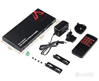 Permette di collegare fino a 4 sorgenti HDMI a 2 display, con supporto completo per 4K a 60Hz, HDR10, 3D e downscaling da 4K a 1080p (utile per schermi misti).