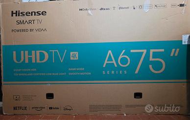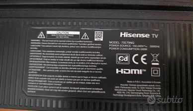 splendida Smart TV Hisense da 75 pollici, risoluzione 4K Ultra HD. Un vero cinema in salotto! La TV è stata testata e funziona perfettamente, come visibile dalle foto reali allegate. Lo schermo è immacolato, senza graffi o difetti di visualizzazione. È stata tenuta con cura e usata pochissimo. Caratteristiche Principali: Pollici: 75 (ideale per un effetto cinema) Risoluzione: 4K Ultra HD per immagini definite e brillanti Smart TV: Sistema operativo [es. VIDAA, se lo sai] con tutte le principali app (Netflix, YouTube, Prime Video, RaiPlay, ecc.) Connettività: [es. 3 porte HDMI, 2 USB, Wi-Fi, Bluetooth - controlla le tue foto per confermare] Digitale Terrestre: Compatibile con il nuovo standard DVB-T2 HEVC (pronta per il futuro senza decoder esterni).
