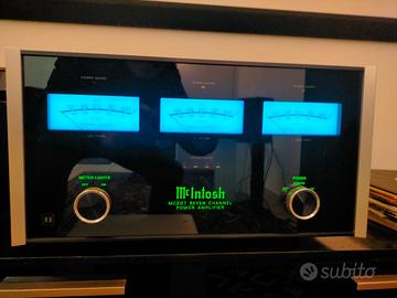 Mcintonsh Mc 2087ampli finale 200wx7 ch. usato in conto vendita. ACCETTO SOLO PAGAMENTO PAYPAL O BONIFICO BANCARIO ISTANTANEO NEGOZIO SPECIALIZZATO MASSIMA SERIETÀ E PROFESSIONALITÀ FRONT PANEL: LED/fiber-optic illuminated green/gold nomenclature. 3 POWER GUARD lights – left front, center and right front. Three illuminated POWER OUTPUT meters (linear WATTS or DECIBELS): 1-LEFT FRONT, 4-CENTER, and 7-RIGHT FRONT. 4 POWER GUARD lights – left surround, right surround, left back surround and right back surround. Remote ON indicator light. METER LIGHTS switch: OFF or ON. POWER switch: OFF, REMOTE or ON. BACK PANEL: Speaker OUTPUTS connectors: Right Front/channel 7, Right Back/channel 6, Left Back/channel 5. Center/channel 4. Left Front/channel 1, Left Surround/channel 2, Right Surround/channel 3. Polished stainless steel chassis. Power cord receptacle. CIRCUIT BREAKER. INPUTS: channel 7 balanced, channels 7 and 6 unbalanced, channels 6 and 5 balanced, channels 5 and 4 unbalanced, channels 4 and 3 balanced, channels 3 and 2 unbalanced, channels 2 and 1 balanced, channel 1 unbalanced. MULTICHANNEL 25 pin INPUT connector. SPECIFICATIONS: Seven channels. 200w/ch into 4 or 8 ohms. Response: 20-20kHz (+0 –0.25dB). Distortion: 0.005%. Noise and Hum: -112dBA. Output Impedance: 4 or 8 ohms. Damping Factor: >60 at 4 ohms or 140 at 8 ohms. Input Impedance: 10k unbalanced and 20k balanced. Input Sensitivity: 1v w/4ohm, 1.4v w/8ohm, balanced, and 2v w/4ohm, 2.8v w/8ohm. Dynamic Headroom: 1.7 dB. Dynamic Power Manager. Sentry Monitor. Direct coupled. Power Guard.