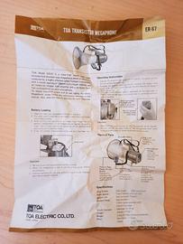 Transistor megaphone ER 67 vintage della Toa. Il megafono Transistor Toa è un megafono a spalla con transistor a stato solido ad altissima potenza, dotato di un altoparlante a tromba Relex ad alta efficienza, con un'apertura di 30 cm e una lunghezza complessiva di 45 cm. Potenza nominale 15 W (max 22 W). Batterie, 8 torcioni, comprese nel prezzo. Nuovo, mai usato nella scatola originale con libretto di istruzione, perfettamente funzionante.