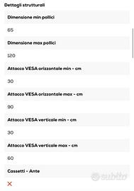 vendo supporto TV EXTRA 900F Meliconi (ho comprato prima questo pensando di comprare anche una TV da 100 pollici nei giorni successivi ma mai presa infatti il supporto è ancora nuovo di pacca, l'ho aperto solo per vedere come fosse appena arrivato e poi sempre stato chiuso nell'armadio)