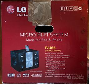 Micro Hi-Fi System LG FA166 esteticamente come nuovo, con telecomando. Purtroppo dopo anni di fermo, funziona tutto tranne il lettore CD. Forse è soltanto da pulire qualcosa dentro, perché fatico a credere che si sia rotto per mancato utilizzo... Comunque questo è.
