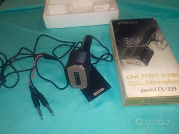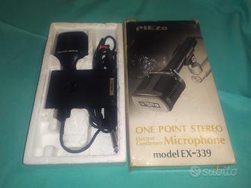 VENDO 2 MICROFONI STEREO VINTAGE. MICROFONO STEREO GRUNDIG GDSM 331, MICROFONO A CONDENSATORE PIEZO EX339, MADE IN JAPAN, COMPLETO DI SUPPORTO E SCATOLA ORIGINALE.