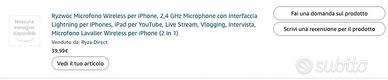 Vendo per inutilizzo coppia di microfoni wireless con ricevitore con attacco Lightning, per iPhone. Marca Ryzwoc. Acquistati su Amazon a 40 euro, come da screenshot allegato. Perfettamente funzionanti.