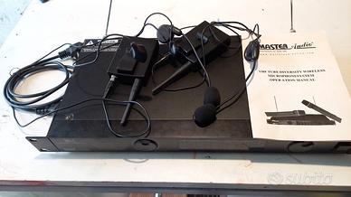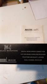 Vendo microfoni wireless Master audio Vm-8200, perfettamente funzionanti. DIGITAL NOISE ERROR CORRECTION VHF HIGH BAND CORDLESS RECEIVER POLOTONE AND QUATZ LOCKED DUAL CHANNEL RECEIVER. Contattami per qualsiasi informazione