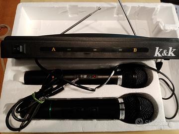 Coppia di microfoni wireless adatti per feste/karaoke/bambini (non per un uso professionale) modello k&k AT-306. Usati molto poco. I microfoni funzionano fino a una decina di metri dal ricevitore. Nella confezione ci sono 2 microfoni alimentati con batterie da 9V e utilizzabili anche contemporaneamente, la centralina di ricezione e un cavo audio per collegarla alla cassa.