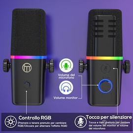 - Cambio modalità con indicatore luminoso (verde per volume microfono, blu per volume monitor).