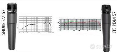 JTS PDM 57 è un prodotto equivalente ad uno Shure SM 57, quindi un microfono a filo professionale dinamico unidirezionale con pattern cardioide indicato per la ripresa di strumenti musicali, come chitarre acustiche e classiche, o rullanti e timpani; naturalmente e' utilizzabile anche per la voce.