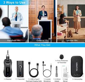 endo microfono lavalier wireless mai usato e con le seguenti caratteristiche: - marca KIMAFUN; - modello KM-G70; - trasmette il segnale audio a 2,4 Ghz; - portata di circa 50 metri in campo libero; - trasmettitore con microfono integrato, clip in metallo e connettore da 3,5 mm per collegare il microfono con filo compreso nella fornitura; - ricevitore dotato di jack da 3,5 mm per collegarlo ad amplificatori, mixer, altoparlanti attivi o altre apparecchiature; - entrambi i dispositivi hanno una batteria agli ioni di litio da 400 mAh. La fornitore comprende: - custodia; - trasmettitore; - ricevitore; - microfono con filo; - adattatore da 3,5 mm e 6,5 mm; - cuffia per microfono; - cavo USB con doppia spina type-C; - manuale in italiano. Prezzo 30 euro non trattabile (non accetto offerte inferiori) con consegna a mano oppure spedizione con TuttoSubito.