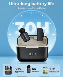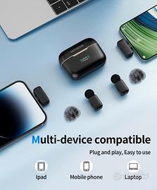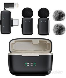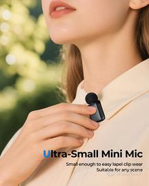 Mini microfono lavalier wireless compatibile con iPhone e Android. Ideale per registrazioni video, vlog, live streaming e interviste. - Design a clip compatto. - Funzione di cancellazione del rumore. - Opzione voice change.