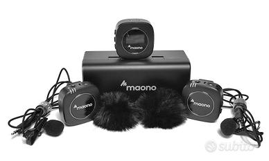 Microfono wireless a 2 trasmettitori e 1 ricevitore per fotocamera, videocamera e telefono. Prodotto che compete con Rode wireless go.