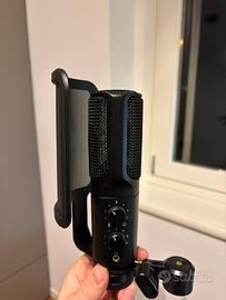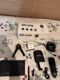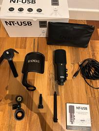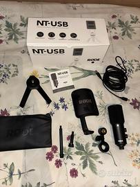 microfono rode quasi mai usato con porta usb e per le cuffie. Alta qualita perfetto per chi vuole iniziare a cantare. Dispone di un piccole treppiede utile per cantare da seduti oppure per podcast, ma ha la possibilitá di essere adattato ad un treppiede da pavimento disponibile sempre nel mio profilo.