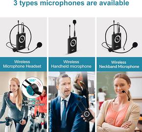 Sistema di microfono senza fili 3 in 1: Microfono ad archetto (il microfono può essere ruotato di 360°), microfono portatile e microfono con archetto da collo. Ampiamente utilizzato per l'insegnamento in classe, lezioni, grandi conferenze, sport e fitness, commenti di guide turistiche...