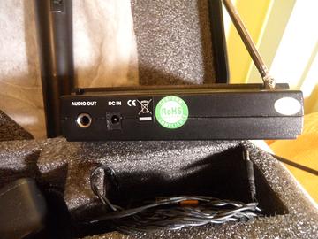 Oggetti in dotazione: un cavo alimentazione, cavo di collegamento con mixer o diretto in cassa, base ricevitore con antenna e volume del radiomicrofono con on/off. Il tutto composto nella sua valigetta originale.