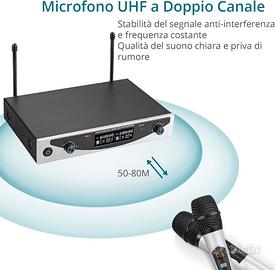 Microfono Wireless Professionale a Doppio Canale UHF senza Fili Palmare con Raggio d'azione di 260 Piedi per Karaoke, Feste, DJ, Chiese, Matrimoni e Riunioni Usi consigliati per il prodottoKaraoke MarchioEKLEVOR Nome modelloEKLEVOR Microfono Wireless Professionale Tecnologia di connettivitàUHF Caratteristica speciale[POSSIBILE] Riduzione del rumore Dispositivi compatibiliAltoparlante ColoreArgento Schema polareBidirezionale Sensibilità audio80 Decibel Peso articolo1,71 Chilogrammi 【Doppio Canale UHF per Prestazioni Wireless Stabili】Il nostro sistema di microfoni wireless adotta la banda di frequenza UHF con doppie antenne, che garantisce una trasmissione del segnale wireless più stabile, meno distorsioni e interferenze rispetto ai sistemi VHF. La portata operativa è di 50-80m, offrendo una maggiore libertà di movimento e meno probabilità di caduta del segnale. 【Qualità del Suono Eccezionale】I nostri microfoni wireless utilizzano un pattern cardioide con gamma dinamica di oltre 80dB, che garantisce un suono chiaro, robusto e privo di rumore statico o feedback. I controlli del volume indipendenti offrono una maggiore flessibilità per regolare il livello del suono in base alle tue esigenze. 【Costruzione Robusta ed Elegante】Il nostro ricevitore UHF a doppio canale è realizzato in lega di alluminio, offrendo un aspetto moderno e un tocco confortevole. Il design compatto e portatile ti permette di portarlo ovunque tu voglia, rendendolo ideale per karaoke, feste, chiese, matrimoni, discorsi, conferenze, lezioni ed eventi all'aperto. 【Plug and Play Facile da Usare】Il nostro sistema di microfoni wireless è facile da installare e utilizzare. I microfoni e il ricevitore si collegheranno automaticamente all'accensione dei canali e l'indicatore LED corrispondente si accenderà, mostrandoti chiaramente lo stato di funzionamento. (Nota: è necessario un altoparlante esterno per connetterti con il nostro ricevitore e far funzionare il suono.) 【Cosa Ottieni】Il pacchetto i