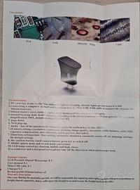 Ciascuna confezione contiene: microcamera/microscopio digitale con batteria a litio, schedina per PC, caricabatterie e foglio illustrativo (English).