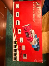 Come da titolo vendo utilissimo Mini Digital Speaker compatibile con Iphone e Ipod! Puoi ascoltare musica, radio e utilizzare sd con brani prescaricati! Insomma utilissimo se hai bisogno di limitare lo spazio! Ha ottime casse nonostante le ridotte dimensioni!
