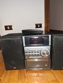 Mini impianto stereo JVC 145W. Dimensioni: larghezza massima cm 47, altezza cm 24, profondità massima cm 42. Radio stereo, lettore CD, porta USB memory per mp3, presa Aux e phones.