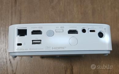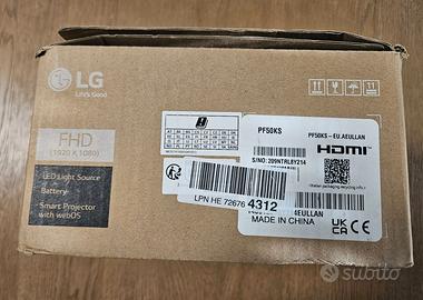 Vendo Mini Proiettore portatile LG PF50KS usato pochissimo ed in stato di conservazione pari al nuovo. Funziona perfettamente e non presenta alcun difetto. La dimensione ridotta permette un trasporto agevole. Risoluzione Full HD 1920x1080 - speaker Integrati - possibilità di collegamento ai dispositivi tramite USB e USB-C, HDMI - uscita audio da 3.5 mm - Bluetooth Wireless - Batteria Integrata 2.5 Ore (audio) - WiFi Dimensioni dello schermo fino a 100 pollici con una risoluzione Full HD 1920 x 1080 Durata della lampada LED fino a 30.000 ore - luminosità 600 ANSI lumens Vendo completo di alimentatore, cavo HDMI e scatola originale. Includo nel prezzo cavalletto estensibile Amazon allungabile sino a 140 cm., supporto per installazione a soffitto e puntatore laser wireless/usb Logitech. Prezzo 250 EURO non trattabili in contanti tramite scambio a mano a Milano. NON SPEDISCO.