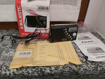 Mini Radio portatile digitale marca Majestic mod. RTD 0453S. (Nuova). Presenta le seguenti caratteristiche: Design: compatto e leggero, con altoparlante integrato e antenna telescopica per una migliore ricezione. Funzioni: Radio FM/AM con scansione automatica dei canali. Orologio digitale con display LCD. Sveglia integrata con opzione di attivazione e disattivazione. Tasti per impostare l’ora, la sveglia e la scansione delle stazioni. Pannello frontale: dispone di tasti per le regolazioni (RESET, SCAN, TIME SET, ALARM HOUR/MIN) e di un interruttore per l’allarme (ON/OFF).