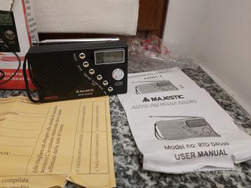 Mini Radio portatile digitale marca Majestic mod. RTD 0453S. (Nuova). Presenta le seguenti caratteristiche: Design: compatto e leggero, con altoparlante integrato e antenna telescopica per una migliore ricezione. Funzioni: Radio FM/AM con scansione automatica dei canali. Orologio digitale con display LCD. Sveglia integrata con opzione di attivazione e disattivazione. Tasti per impostare l’ora, la sveglia e la scansione delle stazioni. Pannello frontale: dispone di tasti per le regolazioni (RESET, SCAN, TIME SET, ALARM HOUR/MIN) e di un interruttore per l’allarme (ON/OFF).