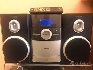 Mini stereo con due altoparlanti e telecomando, riproduzione cd e radio, perfettamente funzionante.