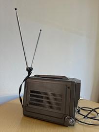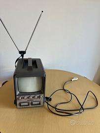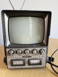 Per collezionisti Per qualsiasi info scrivetemi Informazioni generali Televisore portatile vintage anni '80 Quello mostrato in foto è un televisore portatile a tubo catodico (CRT), tipico degli anni '80. Il marchio riportato è ROTTEN, e il modello RTV-85, con funzioni integrate di radio AM/FM e sintonizzatore TV. Caratteristiche principali: Schermo CRT in bianco e nero di piccole dimensioni. Manopole analogiche per volume, luminosità, contrasto e sintonia. Antenna telescopica per la ricezione del segnale. Doppia funzione: radio AM/FM e televisione. Scala di sintonia separata per radio e TV. Questi apparecchi erano molto diffusi negli anni '80 per la loro portabilità e la possibilità di funzionare anche a batteria o con alimentazione esterna, ideali per campeggio, viaggi o uso in cucina.