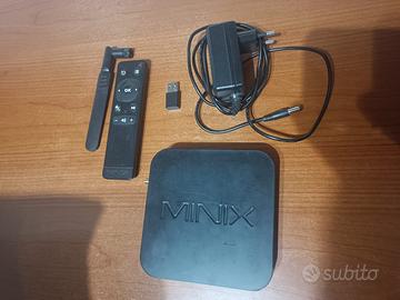 Mediabox del 2015, funzionante. Compreso Telecomando ricaricabile Specifiche: MINIX NEO X8H PLUS Android Smart TV Box Specifications: Processor: Quad-Core Cortex A9r4 Processor GPU: Octo Core Mali 450 Memory: 2GB DDR3 Internal Storage: 16GB eMMC Wireless Connectivity: 802.11 ac Dual-Band Wi-Fi (2.4GHz / 5.8GHz), Bluetooth 4.0 Video Output: Hardware H265 Decoding HDMI, up to 4K @ 30fps Audio Output: HDMI, 3.5mm stereo jack, optical SPDIF; RJ-45 Ethernet jack (10/100/1000Mbps); supports hotspot sharing via WiFi; SD/MMC card reader (SD 3.0, MMC V4.41), Support HDMI-CEC Peripheral Interface: USB 2.0 port x 3; Micro-USB OTG port x 1; Headphone Jack; Microphone Jack IR receiver (remote included) Power: DC 5V, 3A adapter included (CE, FCC, CCC certified) Supported Video Formats: DAT/MPEG/MPE/MPG/TS/TP/VOB/ISO/AVI/MP4/MOV/3GP/FLV/ MKV/M2TS/MTS/M4V/WMV/ASF/RM/RMVB Supported Audio Formats: MP2/MP3/WMA/WAV/OGG/OGA/FLAC/ALAV/APE/AAC