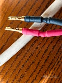 Vendo ottimi cavi per diffusori della prestigiosa casa made in Usa Mit, completamente made in America ,completi dei famosi"scatolotti" brevettati dagli Ingegneri del Suono della Mit , che fanno suonare con grande musicalità e coerenza questi ottimi cavi,questi li avevo comprati e erano finiti con forcella da entrambi i lati,ma li ho fatti recentemente finire a banana da entrambi i latti, lavoro eseguito a regola d' arte da un laboratorio specializzato in Stereo al costo di 100 euro comprese le ottime banane che vedete in foto.Entrambi i cavi sono direzionali e vi assicuro che suonano veramente bene ,per cambiarli ho preso un paio di Wireworld Oasis 10 che costano piu' di 500 euro.Questi Mit, sono molto difficili da trovare usati in questo stato, sono perfetti,rodati e tenuti da un audiofilo "maniaco "del suono.Non fateveli scappare...