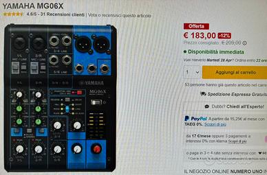 Cerchi un Mixer a buon prezzo? Il mio te lo vendo ad un prezzo di 85€. Se invece optassi per acquistarlo nuovo, lo pagheresti almeno 185€ circa. Si tratta di un mixer Yamaha MG06X [a 6 canali] di terza generazione, con un'interfaccia intuitiva e facile da usare. Questo Mixer offre sempre le massime prestazioni ed un livello di qualità e affidabilità senza pari nella sua categoria. Ecco le sue caratteristiche principali Consolle di mixaggio 6-Canali 2 Mic / 6 Ingressi di linea (2 mono + 2 stereo) 1 Bus Stereo Preamplificatori microfonici "D-Pre" con circuito Darlington invertito Effetti di alta qualità: SPX con 6 programmi Uscite bilanciate XLR Selettore PAD sugli ingressi mono Alimentazione Phantom +48 V Telaio in metallo Alimentatore incluso Confezione originale inclusa Dimensioni: 149 x 62 x 202mm Peso: 0,9 kg