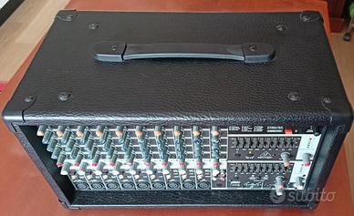 Il mixer e' stato usato sporadicamente solo in studio e non presenta difetti estetici o di funzionamento. Viene venduto nella sua scatola originale, e grazie al suo amplificatore integrato, si collega direttamente ad una coppia di casse passive (non amplificate ). Cavi e casse non compresi. Alcune caratteristiche estratte dal suo libretto: Potenza: 2 da 1000 W di potenza massima a 4 Ohm/canale // 2 da 250 W RMS a 4 Ohm/canale Amplificatore di potenza in classe D 9 ingressi microfonici con alimentazione phantom da 48 V FX con 25 preset come Reverb, Chorus, Flanger, Delay, Pitch Shifter e vari multieffetti Sezione mixer a 14 canali con 6 canali mono e 4 canali stereo EQ a 3 bande Doppio equalizzatore grafico a 9 bande