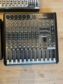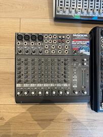 🎛️ Behringer Xenyx X2442USB 💲240€ Mixer analogico 24 ingressi / 4 bus con USB. •Fino a 24 ingressi (mono + stereo) •10 preamp XENYX con phantom +48V •8 compressori “one-knob” •EQ: 3 bande (mono, medi semi-parametrici) / 4 bande (stereo) •Multi-effetto digitale 24-bit integrato •4 subgruppi + main mix •Fino a 4 AUX per canale (pre/post) •Insert su canali mono e main •USB audio 2x2 •Uscite XLR, TRS, control room, rec •Risposta: 10 Hz – 200 kHz •Peso: 6.4 kg ⸻ 🎛️ Mackie 1202-VLZ Pro 💲140€ Mixer analogico compatto 12 canali. •12 canali (4 mono mic/line + 4 stereo) •4 preamp XDR •Gain: 0 – +60 dB •EQ 3 bande (80 Hz / 2.5 kHz / 12 kHz) •Filtro low-cut 75 Hz •2 AUX send •Bus: main + ALT 3/4 •Ingressi XLR, jack, RCA •Uscite main, control room, tape •Max input: +22 dBu •THD: ~0.0007% •Risposta: 10 Hz – 100 kHz •Peso: 3 kg ⸻ 🎛️ Mackie ProFX12 💲210€ Mixer analogico 12 canali con effetti e USB. •12 canali mic/line + stereo •Preamplificatori Vita •EQ 3 bande per canale •Effetti digitali integrati (reverb, delay, modulation) •USB audio stereo •EQ grafico stereo 7 bande •AUX monitor + FX •Return stereo dedicati •Uscite main, control room, cuffie •Phantom +48V •Routing main + monitor •Fader 60 mm