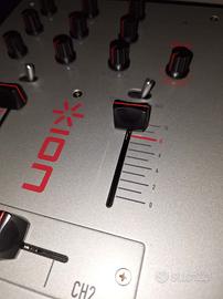 Mixer a due canali con collegamento per CDJ e Giradischi. Ingresso per microfono e cuffie per pre ascolto.