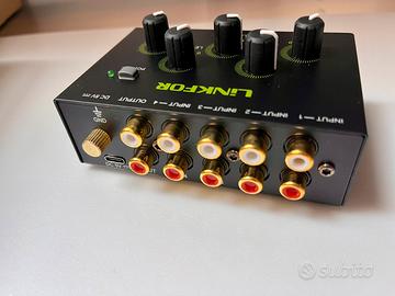 Mixer audio Linkfor a 4 canali in ottime condizioni. Perfetto per collegare più dispositivi audio (PC, TV, console, casse, impianti stereo). Funzionamento semplice e immediato, senza bisogno di configurazioni. ✔ 4 ingressi RCA ✔ Controllo volume ✔ Compatto e facile da usare ✔ Ideale per casa o setup audio