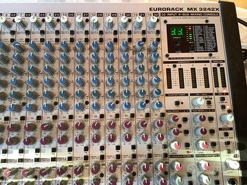 Vendo in ottimo stato completo.. Behringer Eurorack MX3242X È un mixer analogico che può essere utilizzato in studio e dal vivo, 16 canali microfonici con filtro passa alto, equalizzatori a quattro bande, sei mandate monitor, due sotto gruppi, 16 ritorni tape per un totale di 32 ingressi analogici, processore effetto a 20 bit integrato, direct out per ogni canale, talkback integrato..