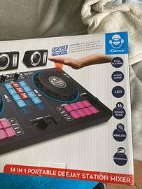 Console/mixer Music Star completa di imballaggio originale e manuale, pari al nuovo, e perfettamente funzionante. Comprende due casse e la funzione lettura MP3 da micro SD. Consegna a mano