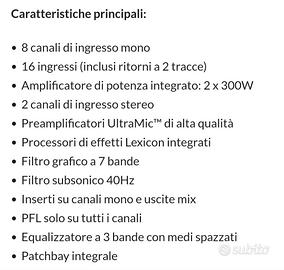 vendo questo super-mixer amplificato 300watt rms per canale con effetti Lexicon usato con cura e ancora perfettamente funzionante. Non ha mai preso colpi e facile da trasportare chiuso dentro il suo flightcase fatto su misura con maniglie e ruote girevoli a 360 gradi. Va usato collegandolo a casse passive (non amplificate). preferisco consegna a mano per evitare imprevisti in spedizione ma se necessita saprei come proteggerlo. Ho anche possibilità di trasporto e consegna personale in diverse località del centro-nord. per qualsiasi informazione contattatemi, grazie.