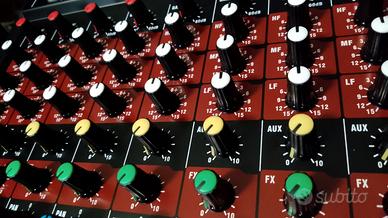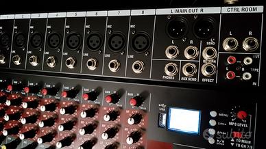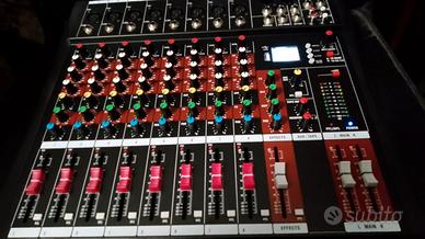 Mixer stereo 8 canali + effetti reverbero-eco, ingressi con doppia presa Micro-XLR e Linea-Jack, regolazione toni bassi-medi-alti per ogni canale, alimentazione phantom per i microfoni a condensatore, 1 mandata AUX, 1 mandata effetti, ingresso/uscita tape-aux, 2 Uscite XLR e Jack. Il mixer è nuovo usato 1 volta ma non funziona più il lettore MP3-Bluetooth, tutto il resto funziona perfettamente