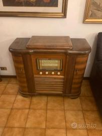 Combina una radio a valvole e un giradischi in un unico mobile in legno.